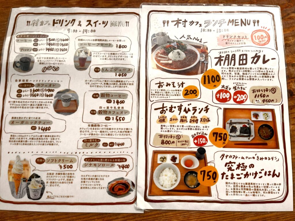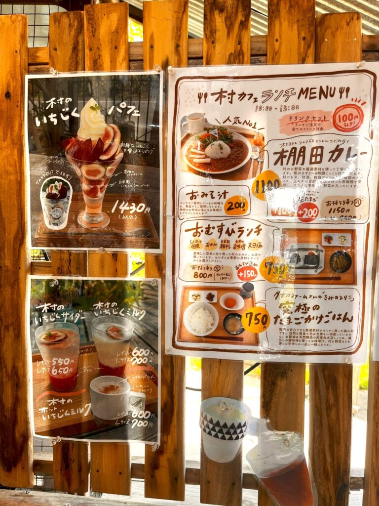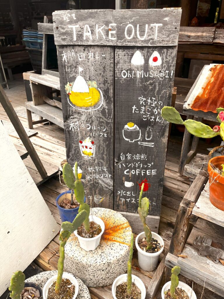 可愛いテイクアウト紹介と2Fへの村カフェへの案内看板💕
